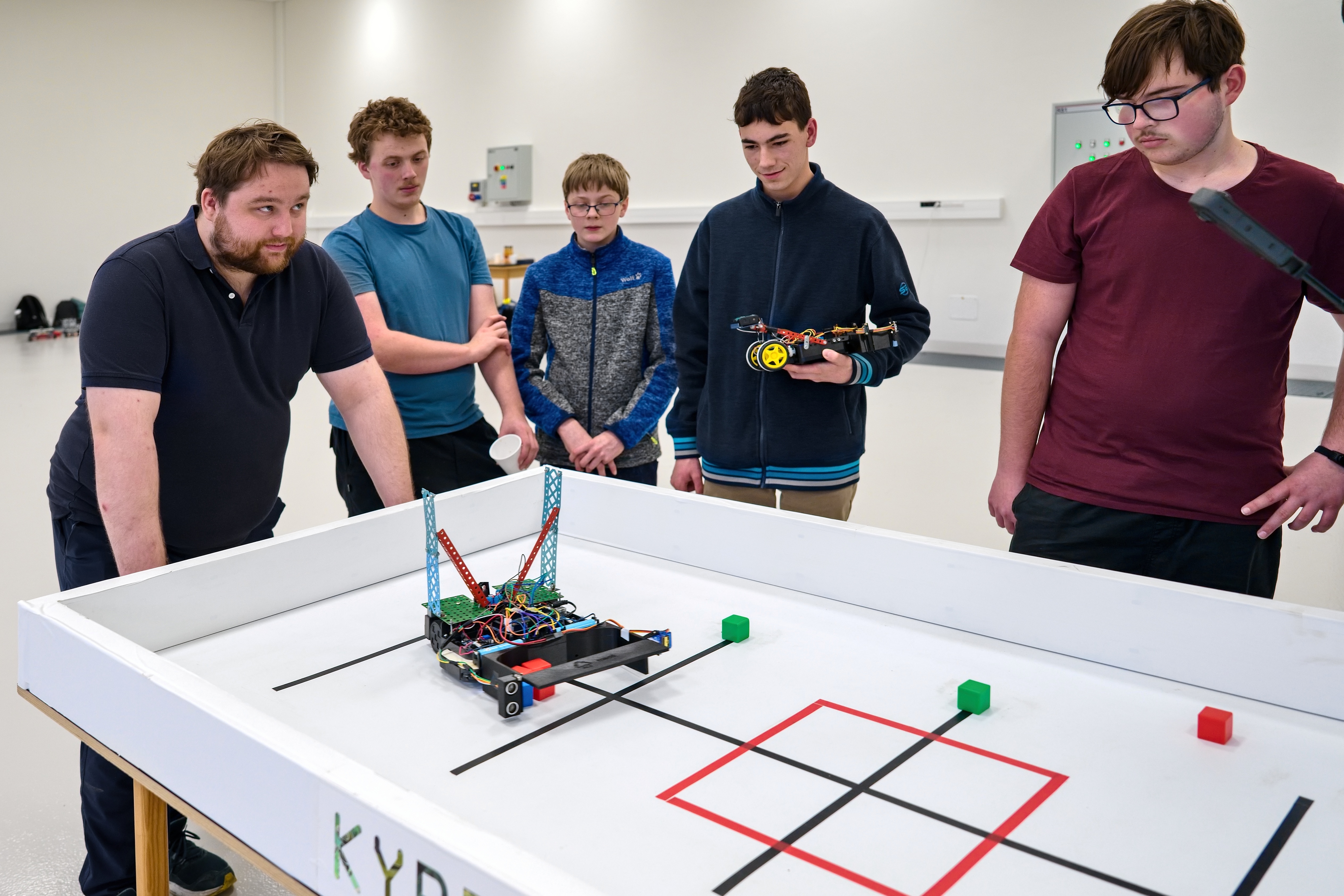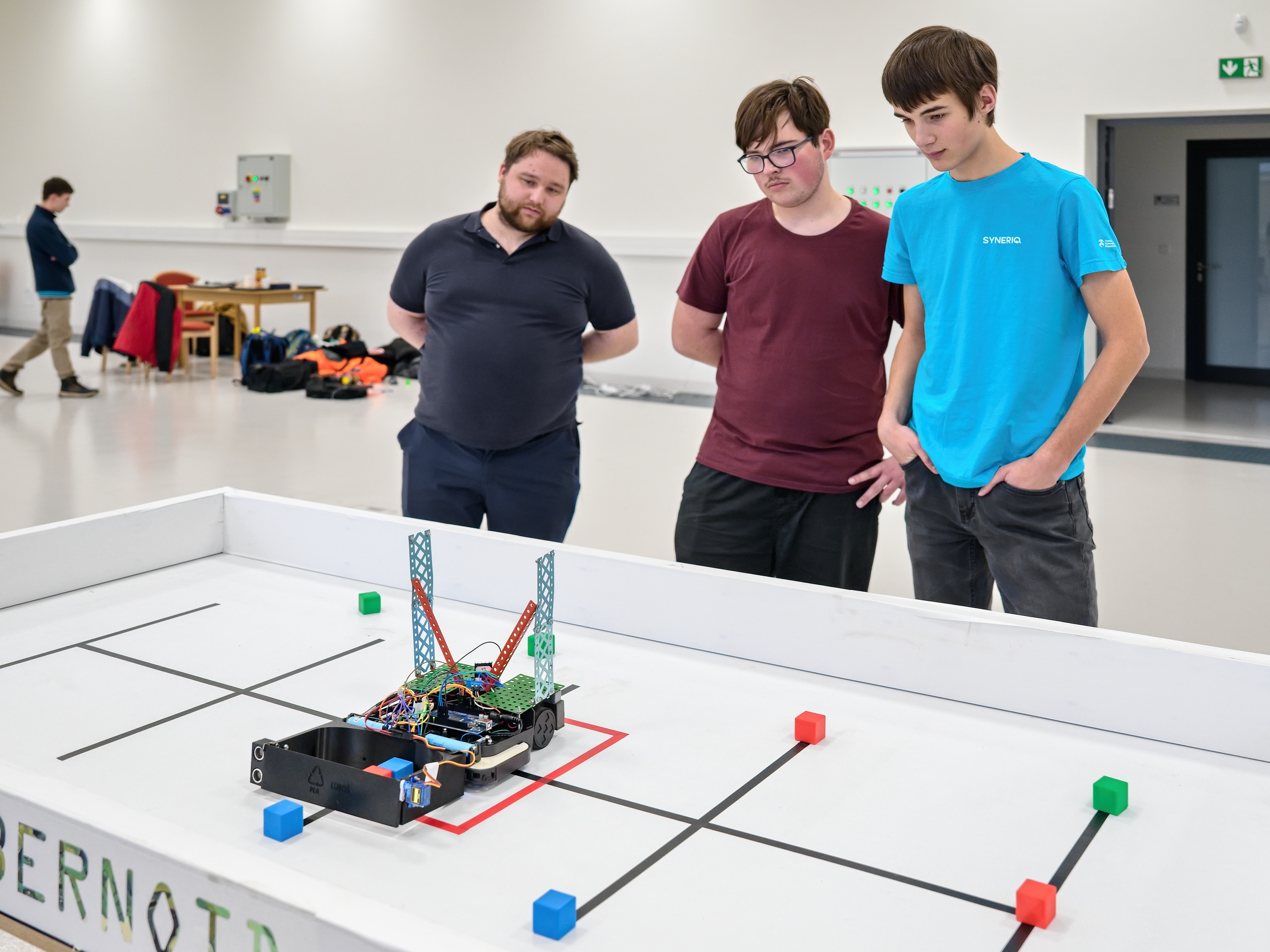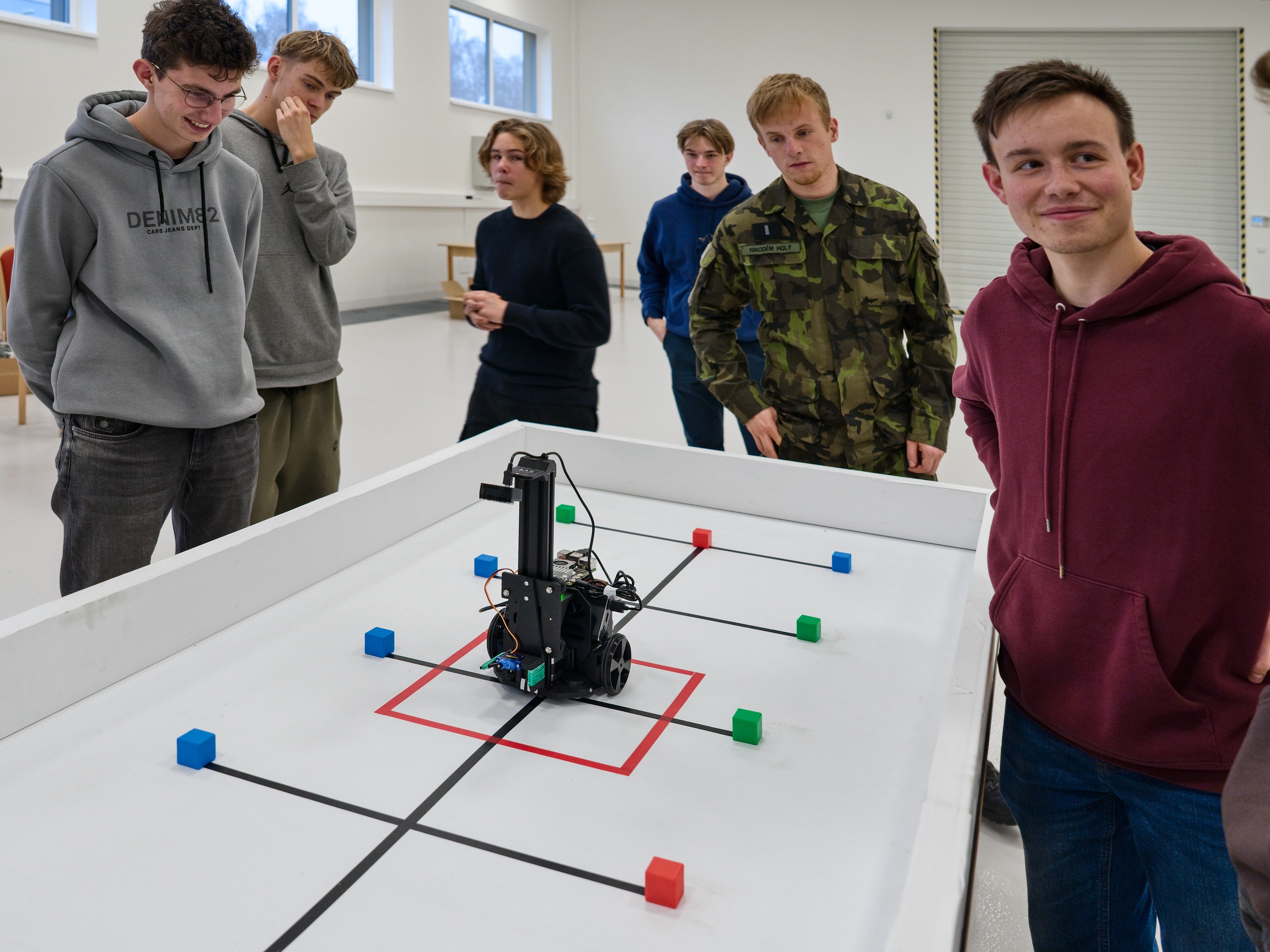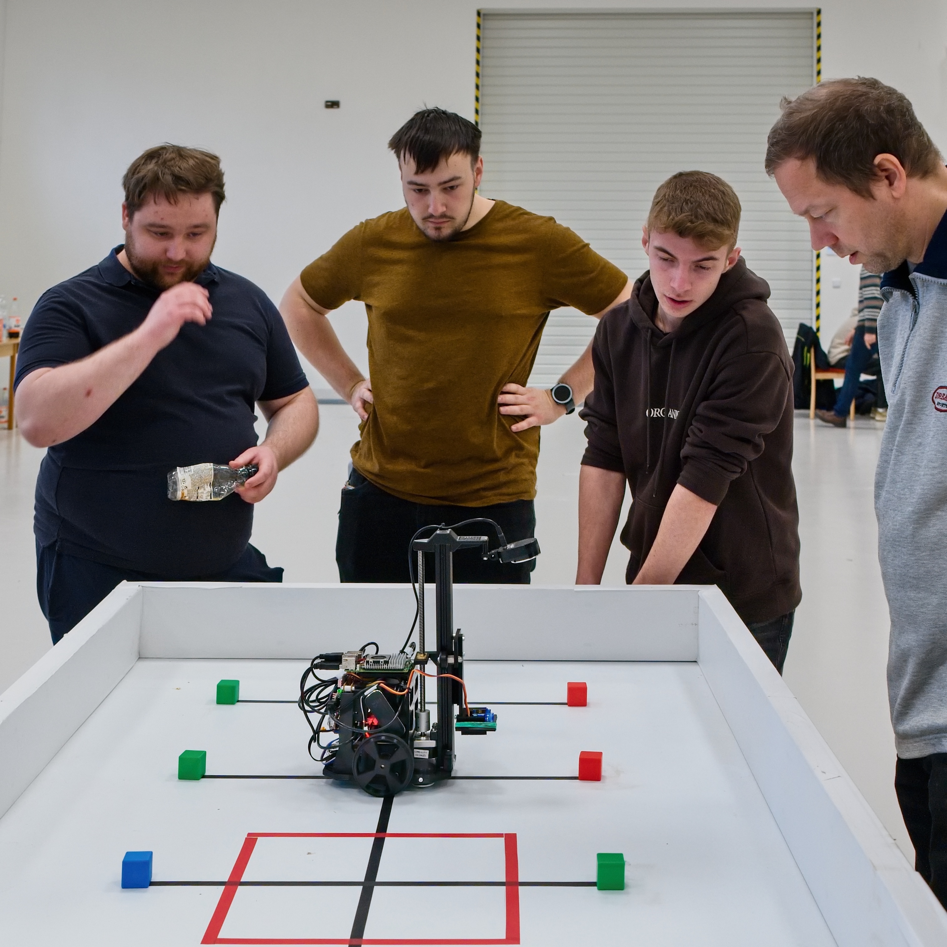 Robot má přesně 3 minuty na to, aby autonomně posbíral co nejvíce barevných krychlí (3 × 3 × 3 cm, barvy červená, modrá, zelená – celkem 12 kusů) a přenesl je do červeného čtverce uprostřed hrací plochy (cca 100 × 200 cm, bílý povrch s černými navigačními čarami).