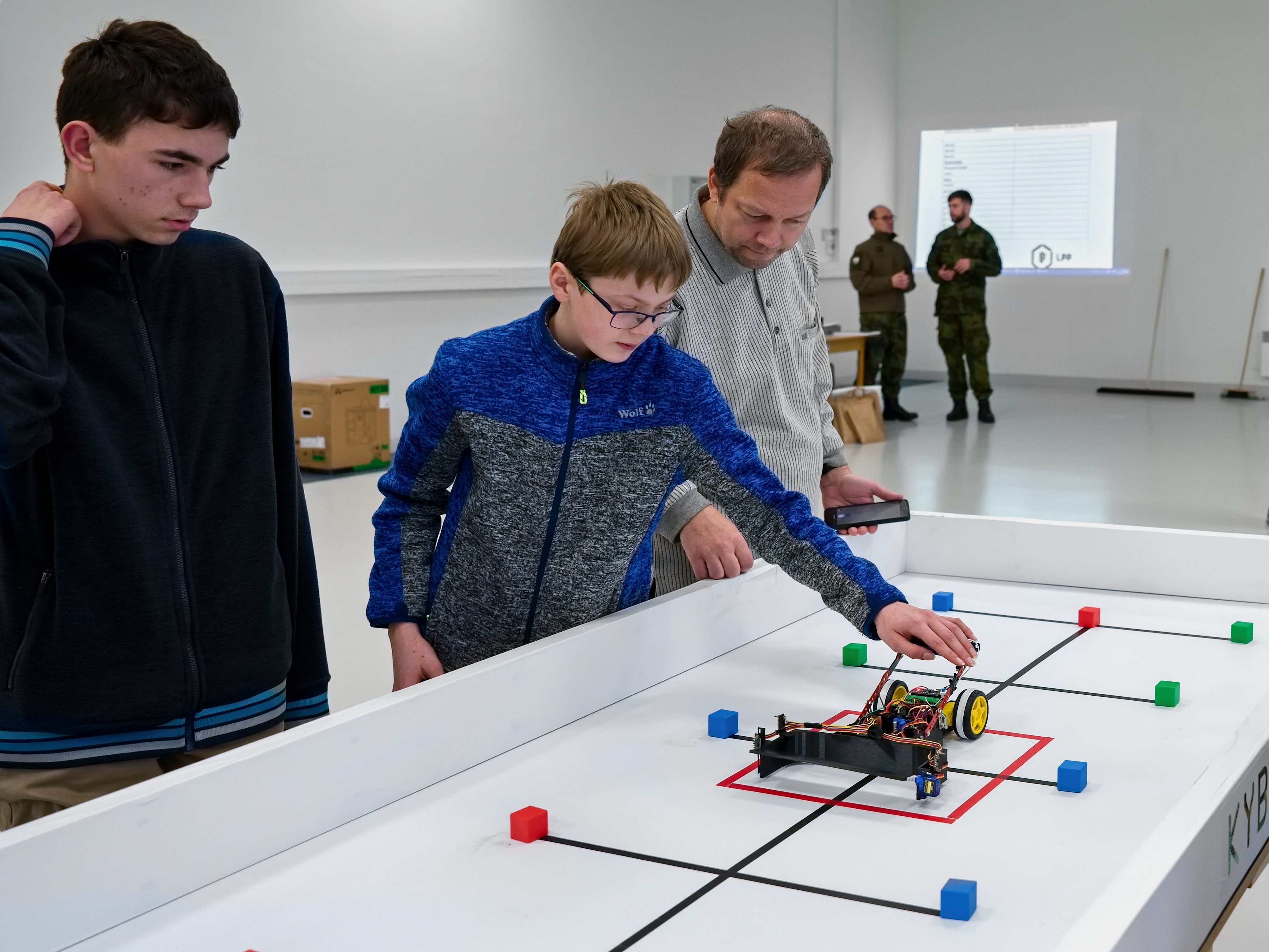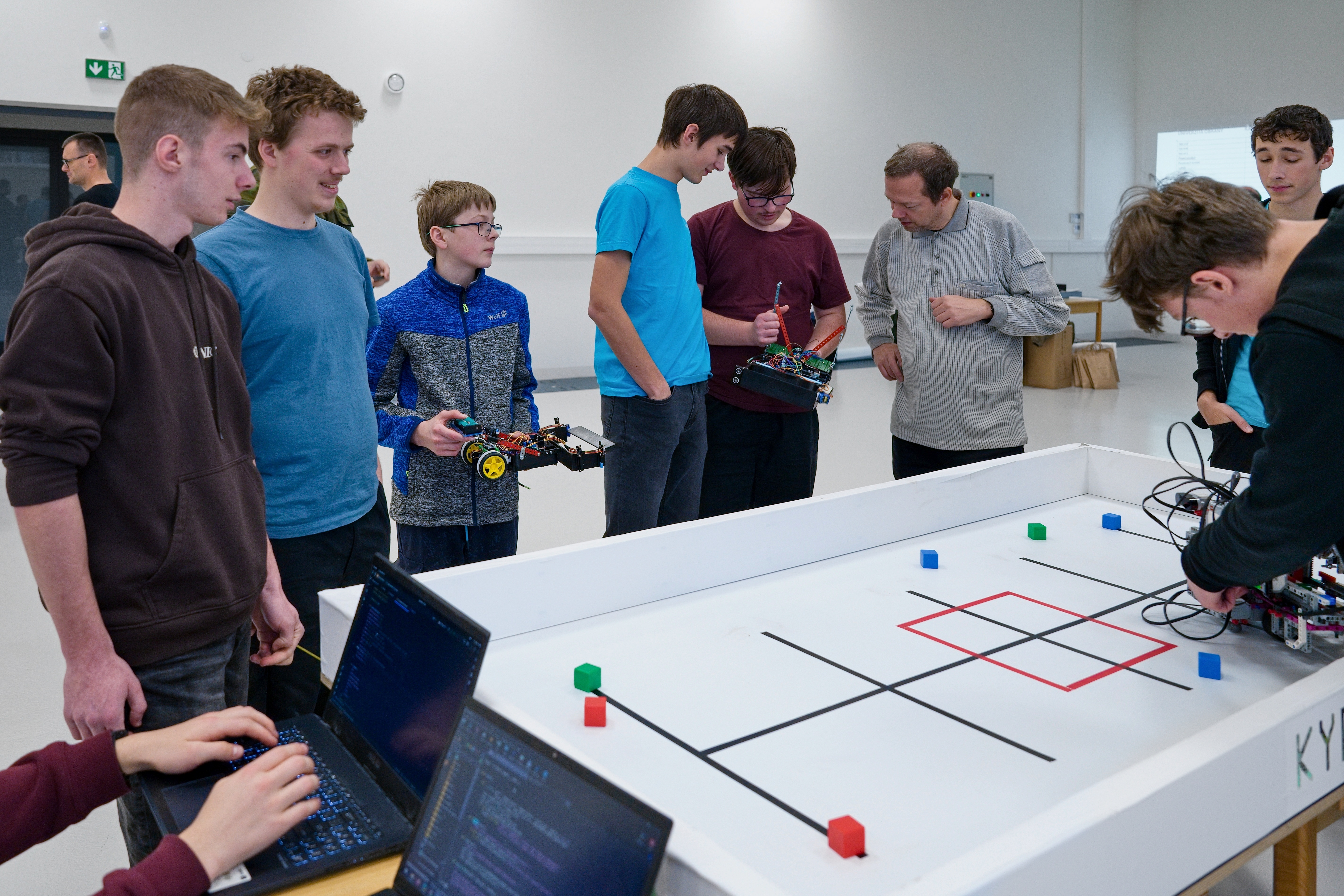 Po příjezdu jsme se pustili do ladění hardwaru i softwaru. Organizátoři nás upozornili, že roboti by měli být již funkční a další úpravy nejsou možné. Naštěstí nám nakonec dali ještě hodinu na testování.