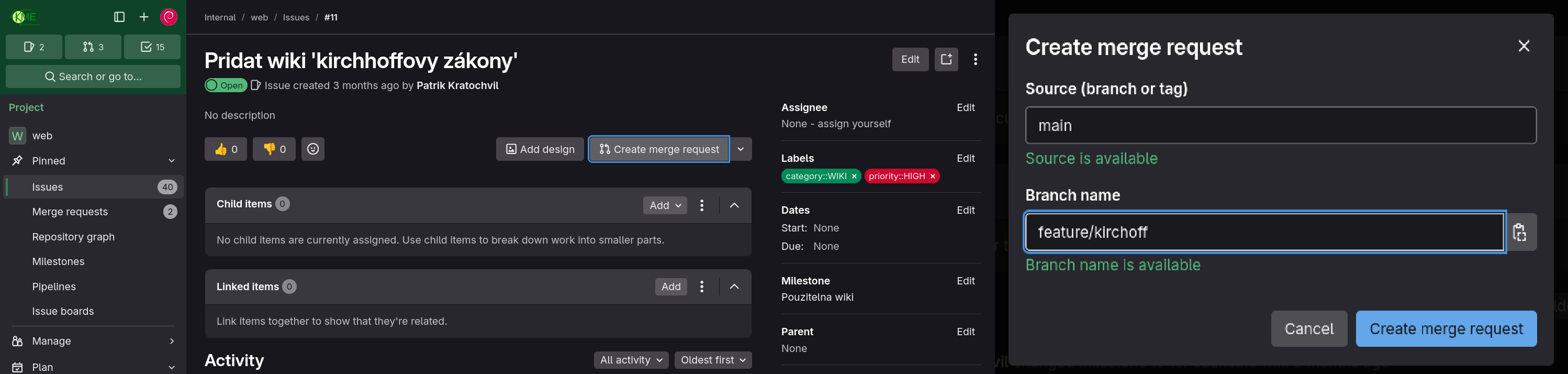 Pro vytvoření MR je nutné, aby existovala větev, kterou chcete mergnout. Tu můžete vytvořit pomocí standardních nástrojů nebo, pokud se jedná o MR, který bude řešit nějaké issue, můžete vytvořit větev v rozhraní issue.