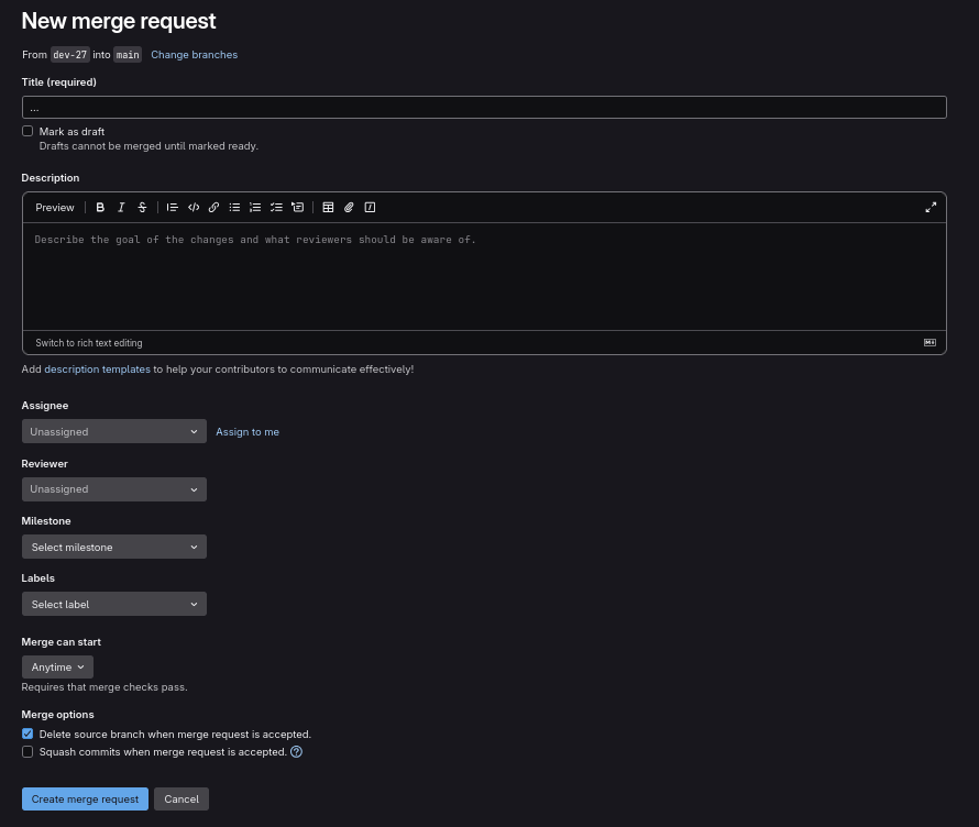 MR vytvořte pokaždé, pokud potřebujete nechat zkontrolovat změny před mergem do nějaké větve. Pokud mergujete pracovní větev do mainu, je vhodné vždy vytvořit MR.