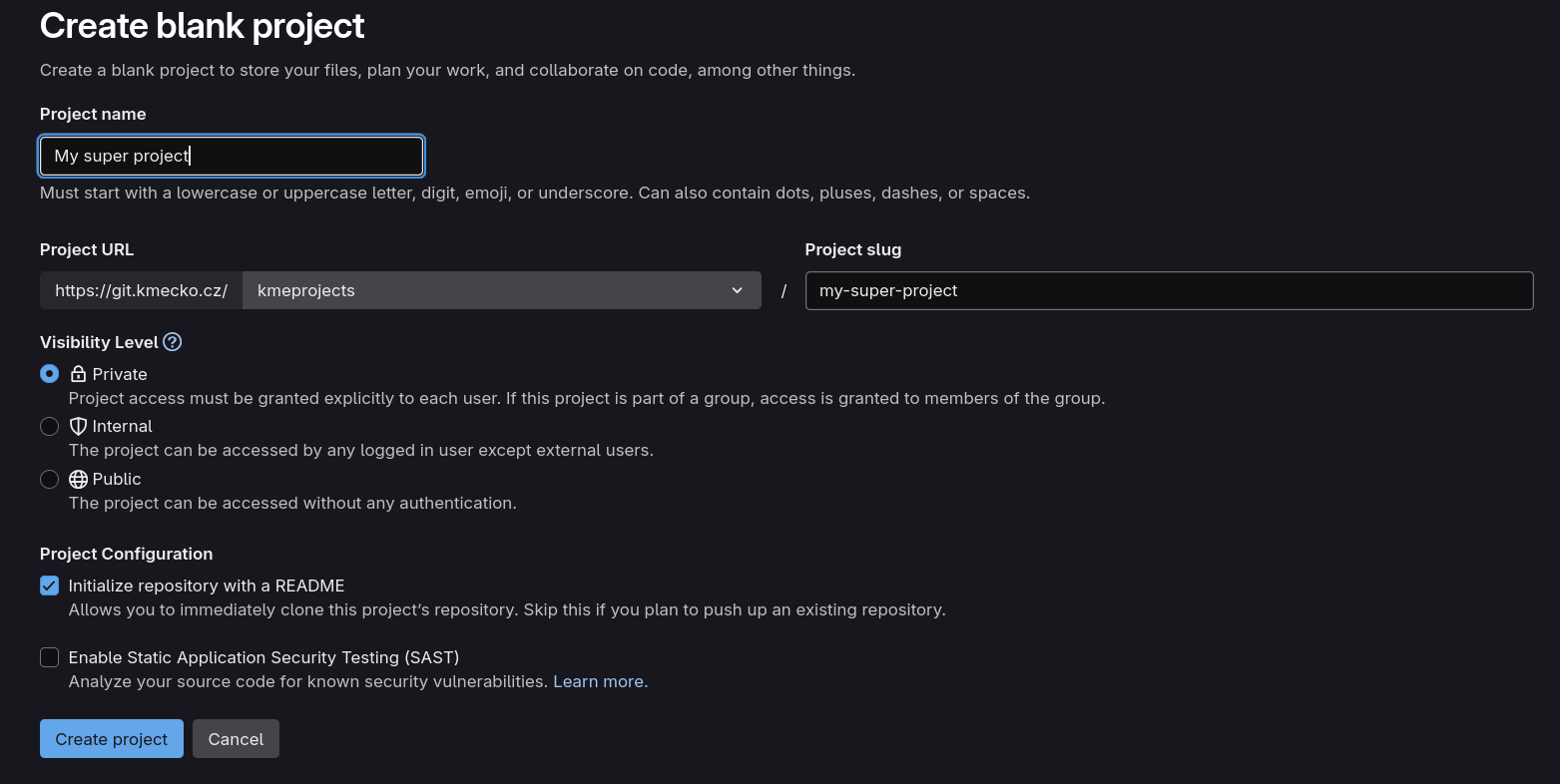 Políčko Initialize with a README ponechte aktivované a Visibility Level mějte na Private.