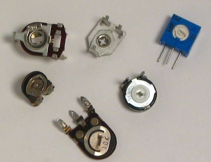 - Trimr - toto označení je pro potenciometr, který se nastavuje nástrojem (například šroubovákem), u zapojení s trimrem se většinou předpokládá, že se hodnota jednou nastaví a nebude se často měnit